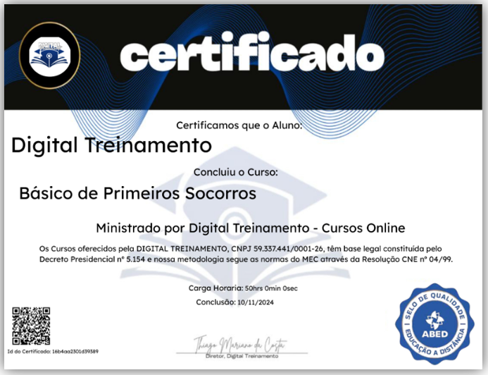 Ao concluir o curso, você pode emitir seu certificado digital na hora. Totalmente autenticado pela DIGITAL TREINAMENTO e em formato PDF, ele é a melhor forma de comprovar sua qualificação e investir na sua carreira, mostrando que você se atualizou para o mercado de trabalho.